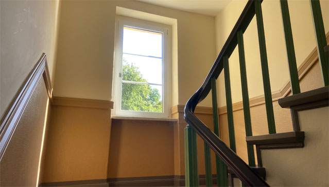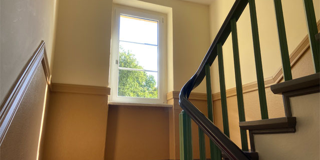 Nach mehrjähriger Bauzeit wurden die Sanierungsmaßnahmen in der Pankower Wohnanlage WIE 101 in diesem Herbst erfolgreich abgeschlossen. In 36 Treppenhäusern wurden alle Elektrosteigeleitungen erneuert sowie nachfolgende Malerarbeiten durchgeführt. Nun erstrahlen die Hausflure der 1920 erbauten und unter Denkmalschutz stehenden Wohnanlage im historisch neuen Glanz.