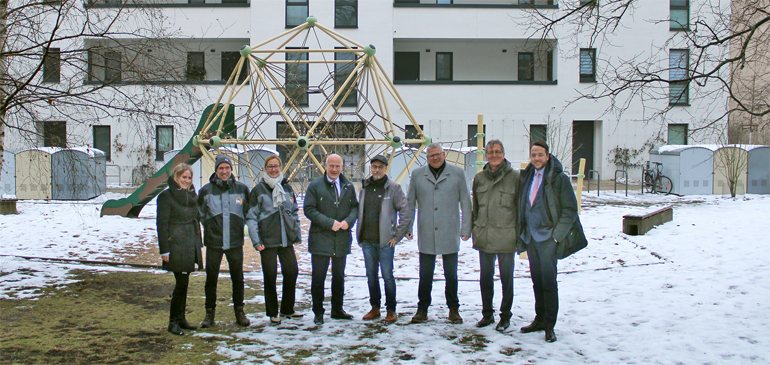 In der Wohnanlage an der Jungfernheide mit zwei Neubauten und insgesamt 31 Wohneinheiten wurden die Gäste von den Vorständen Jens Kahl und Kerstin Kirsch sowie Dirk Enzesberger und Carsten Röding empfangen. Bei einer anschließenden Führung erhielten die Besucherinnen und Besucher Einblicke in das gemeinschaftliche Bauprojekt und die erfolgreiche Zusammenarbeit der beiden beteiligten Genossenschaften. Ein besonderer Höhepunkt war der Besuch der Dachgärten, die als Orte der Begegnung und des sozialen Miteinanders für alle Anwohnenden konzipiert sind.