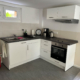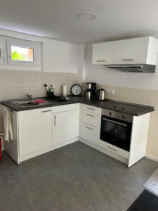 • Küchenzeile mit Herd, Kühlschrank, Schränken, Geschirr, Besteck und Töpfen